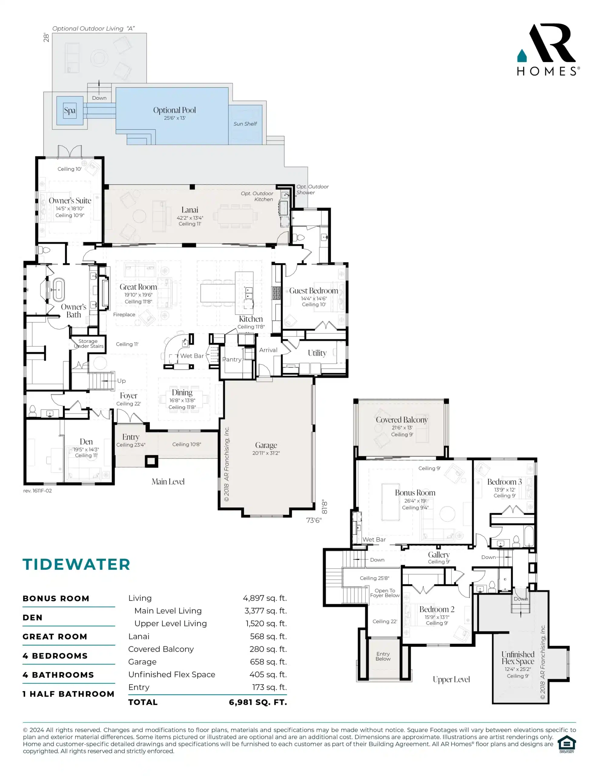 The Tidewater spans nearly 5,000 square feet across two stories with a spacious great room, formal dining room, den, and an upstairs bonus room with additional unfinished flex space. Unique ceiling details, upscale finishes, and abundant windows create a light, inviting atmosphere throughout. The expansive lanai offers a resort-style setting for year-round enjoyment. Build the Tidewater in Emerald Palms, a private gated community with easy access to shopping, dining, and major roadways